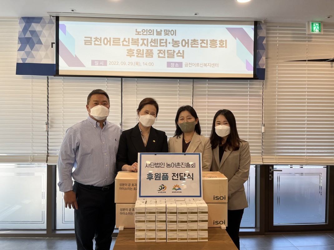 | 금천50플러스센터 및 (사)농어촌진흥회 관계자들이 후원품 전달식 이후 기념사진을 촬영하고 있다. (사진= 노익희 기자) |